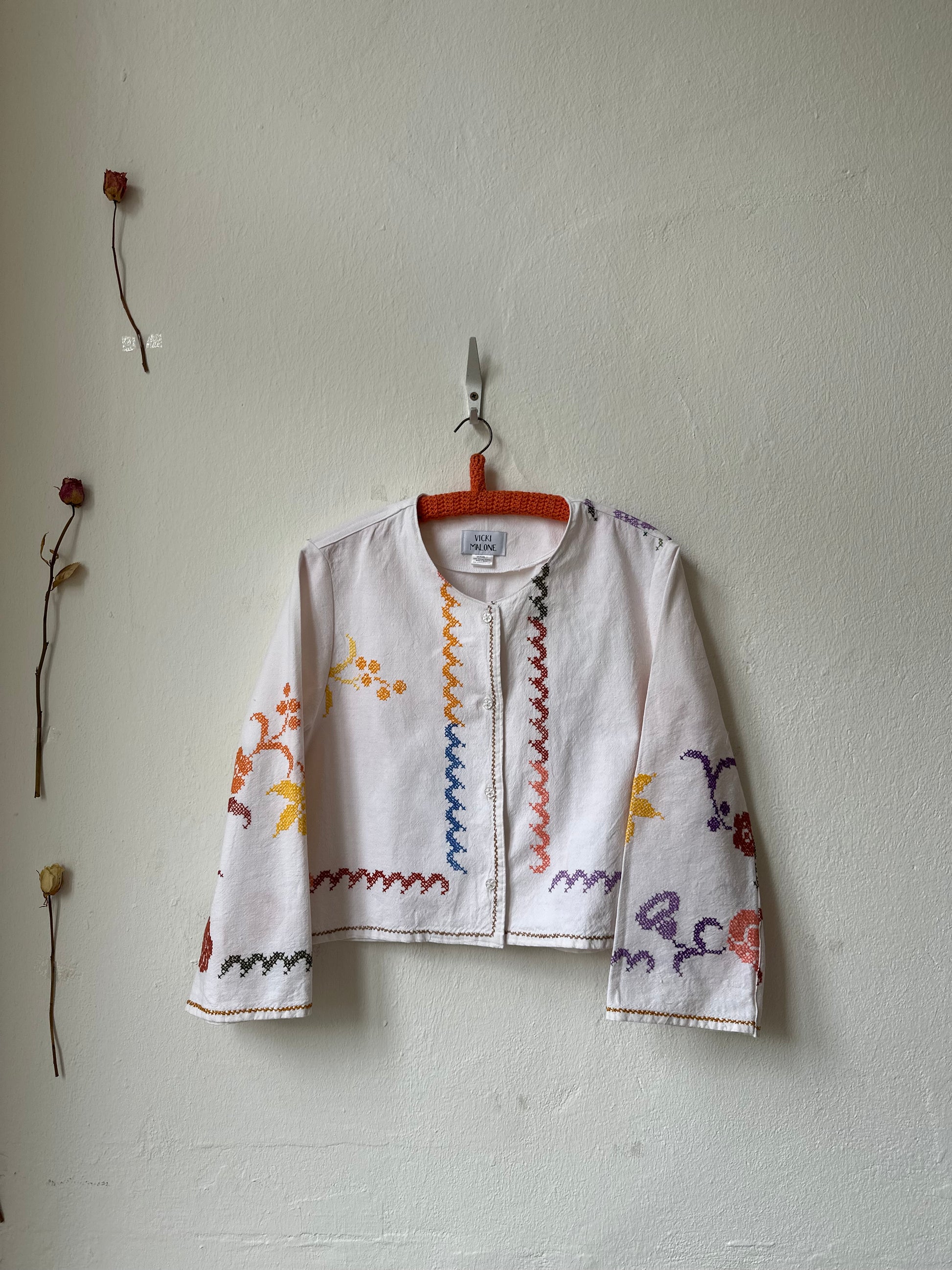 Using an colourful embroidered tablecloth, this Beth blouse uses the original edges to create a simple yet beautiful blouse. Button front fastening and long sleeves.