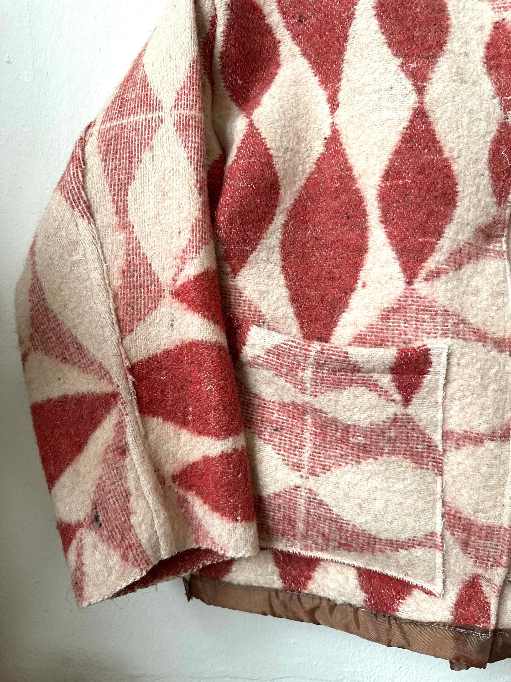 Originally a wool mix blanket , this Iti jacket has snap fastening and pockets, allowing the geometric pattern of the original textile to be showcased in the simple silhouette.