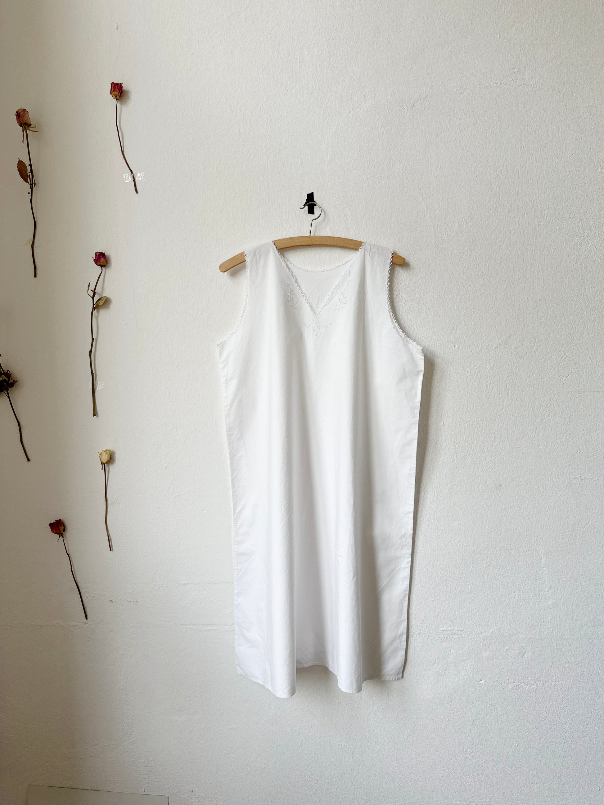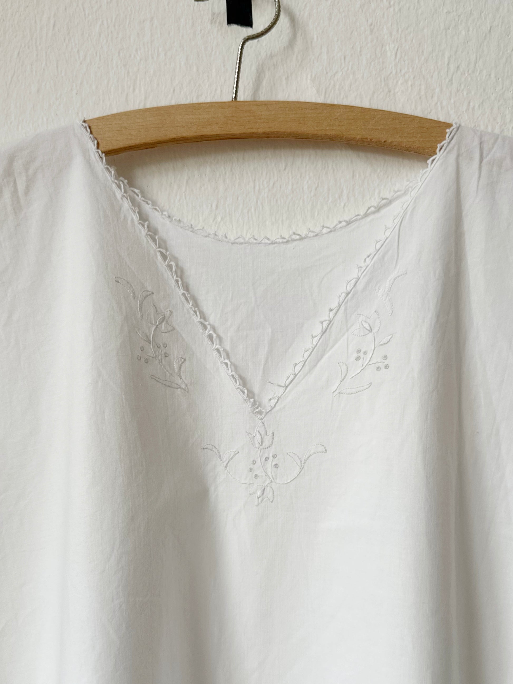 V-Neckline 60s Vintage Nightgown/Dress. Pretty embroidery around neckline with delicate scallops around and armholes. Below knee length.