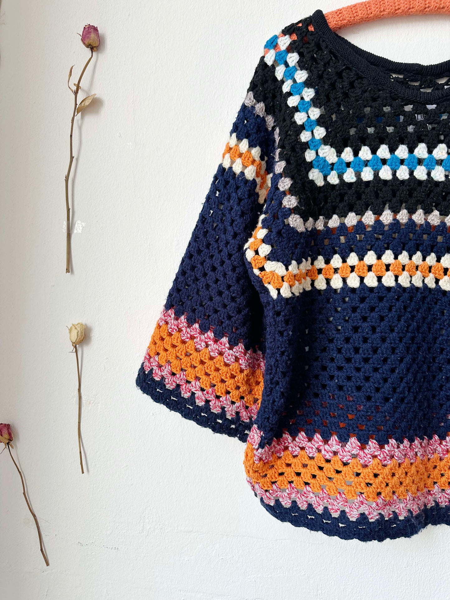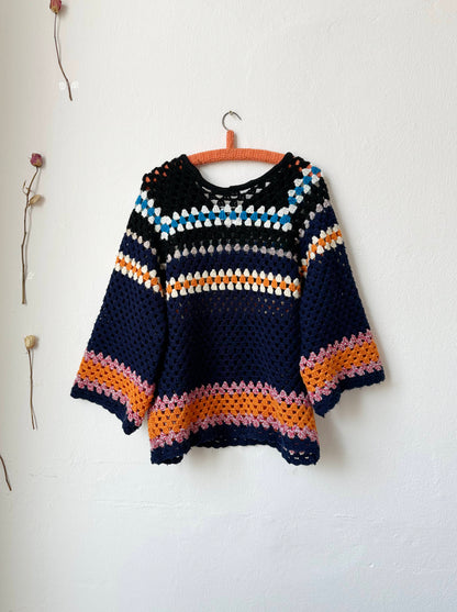 A fun crocheted striped blanket has been reimagined into a tunic style sweater with flared sleeves and wide neck. Lightweight yet cosy.